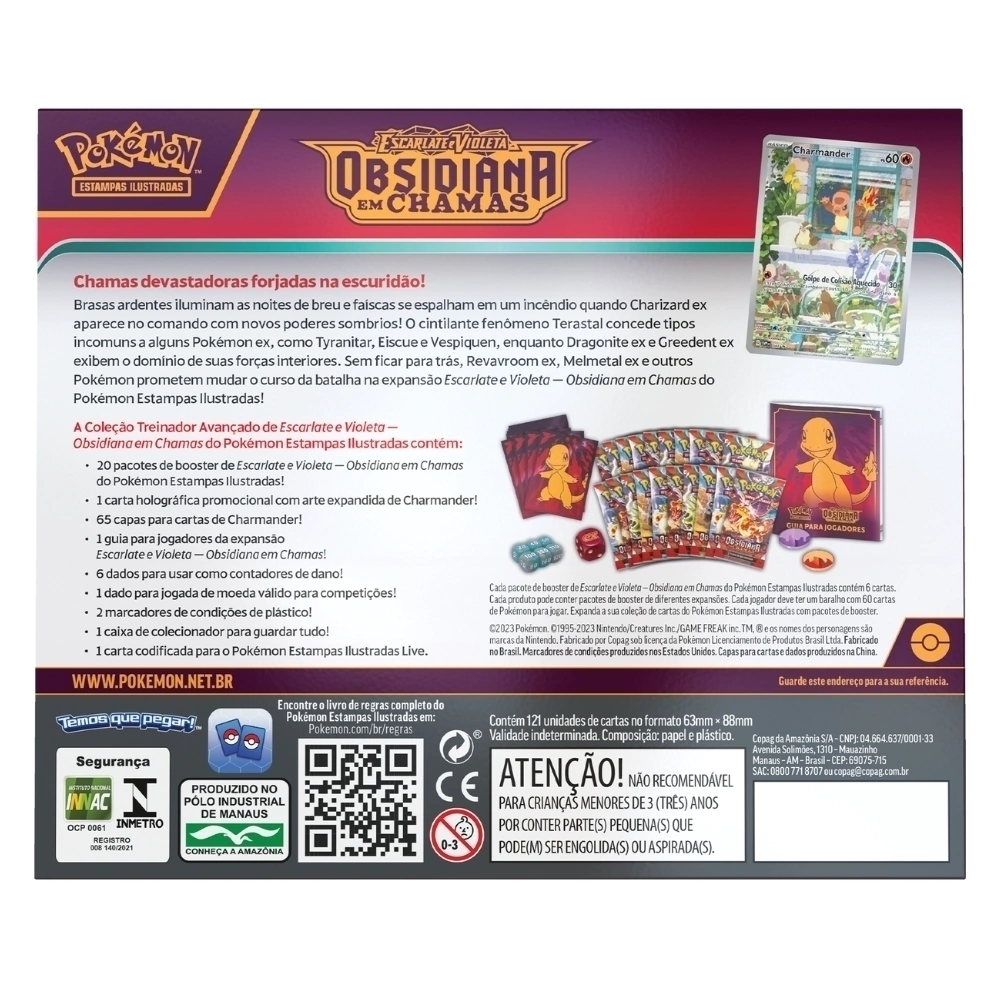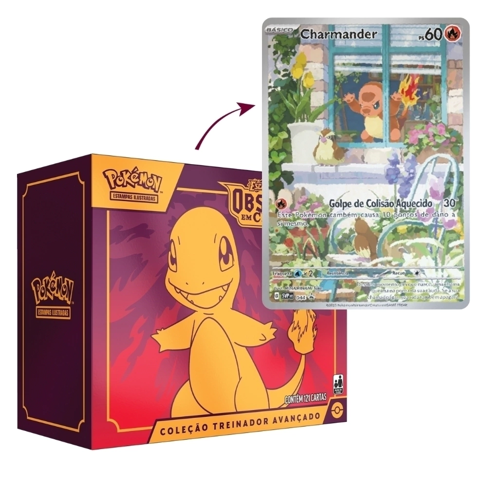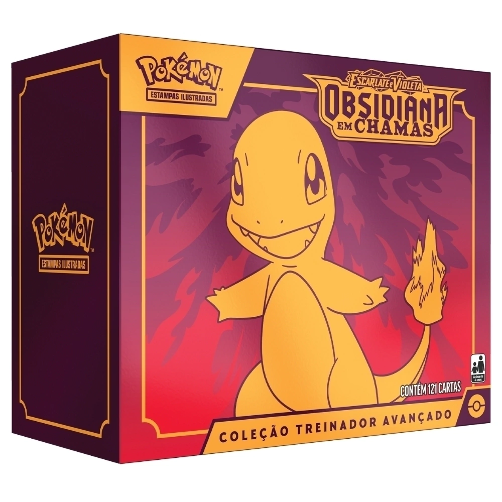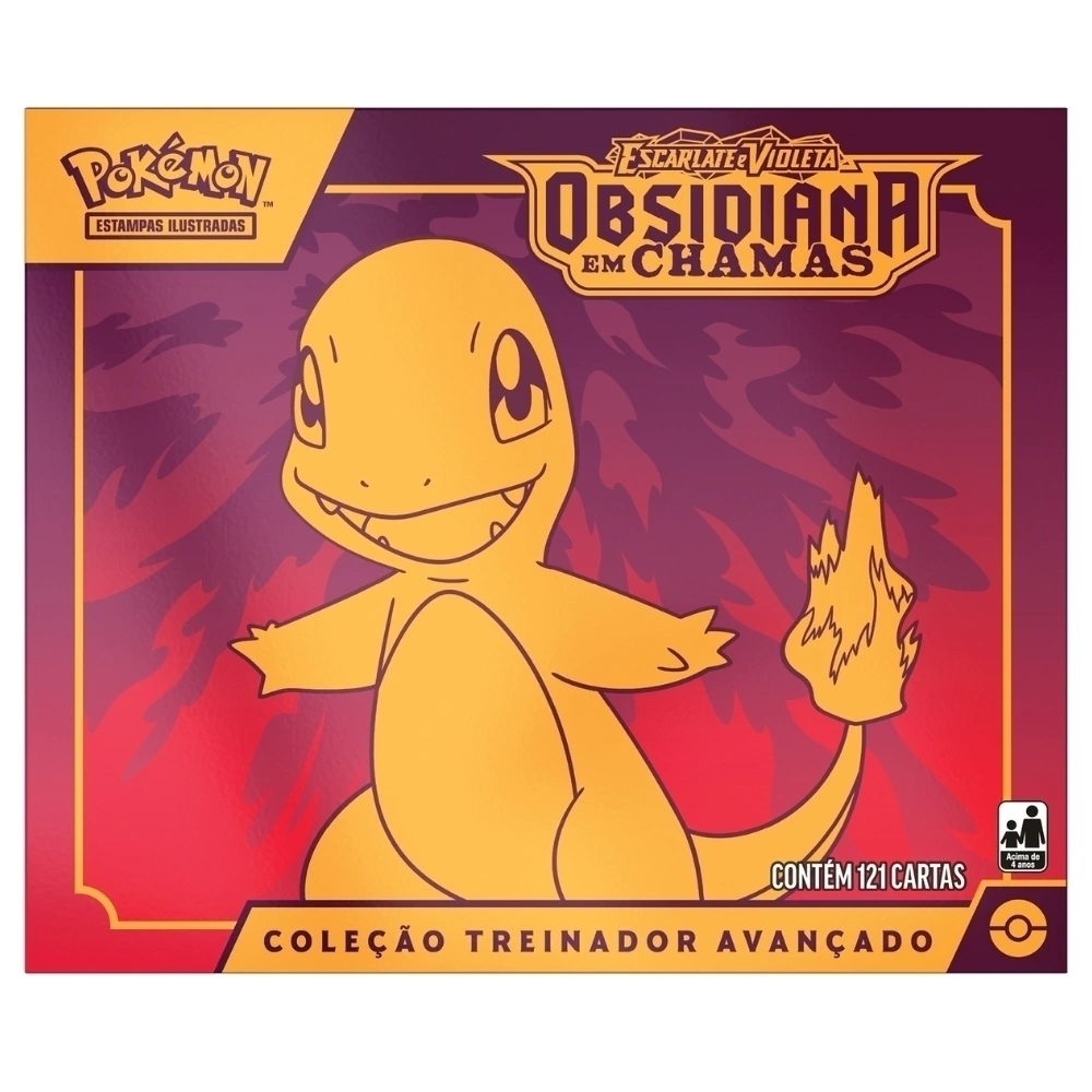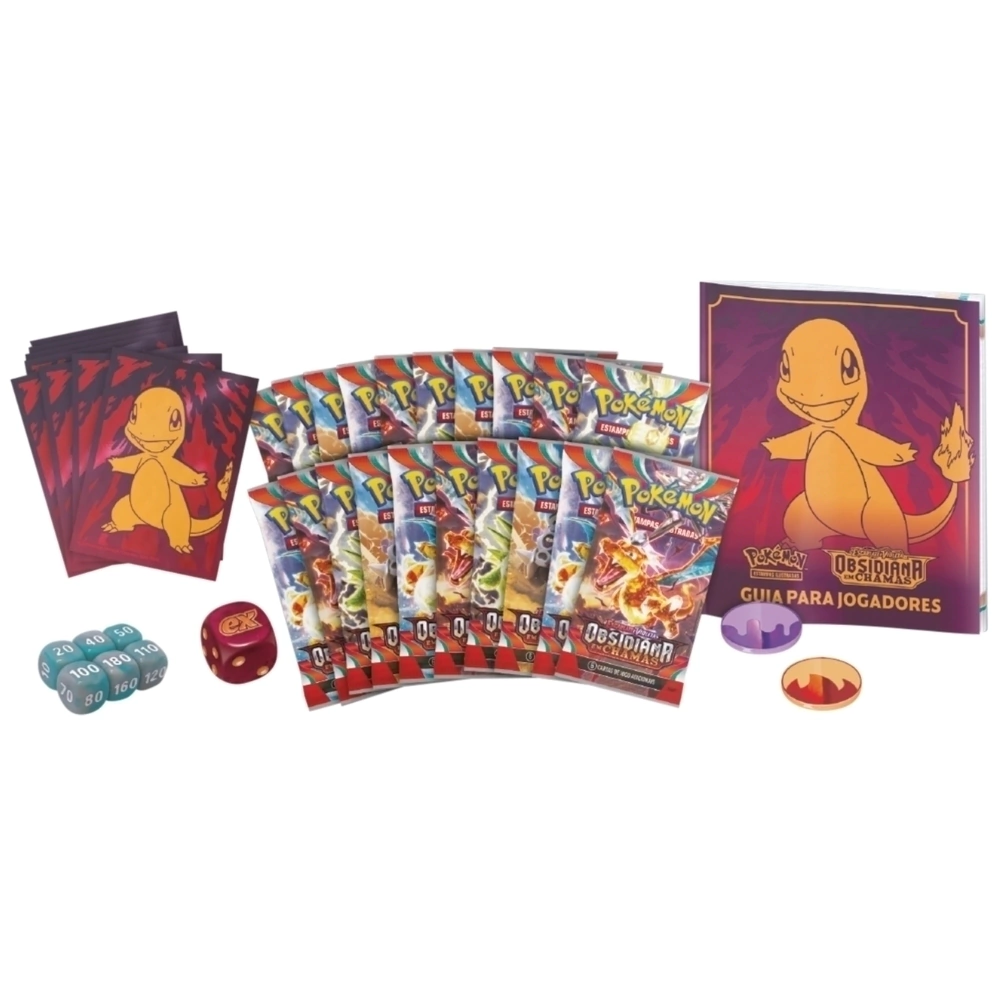 - 20 pacotes de booster de Escarlate e Violeta — Obsidiana em Chamas do Pokémon Estampas Ilustradas; - 1 carta holográfica promocional com arte expandida de Charmander; - 65 capas (Sleeve estampado) para cartas de Charmander; - 1 guia para jogadores da expansão Escarlate e Violeta — Obsidiana em Chamas; - 6 dados para usar como contadores de dano; - 1 dado para jogada de moeda válido para competições; - 2 marcadores de condições de plástico; - 1 caixa de colecionador para guardar tudo; - 1 carta codificada para o Pokémon Estampas Ilustradas Live;