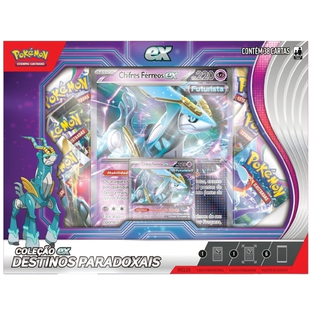 - A variação (Chifres Férreos EX) Contém: 1 Unidade da Box Pokémon Chifres Férreos EX Destinos Paradoxais;