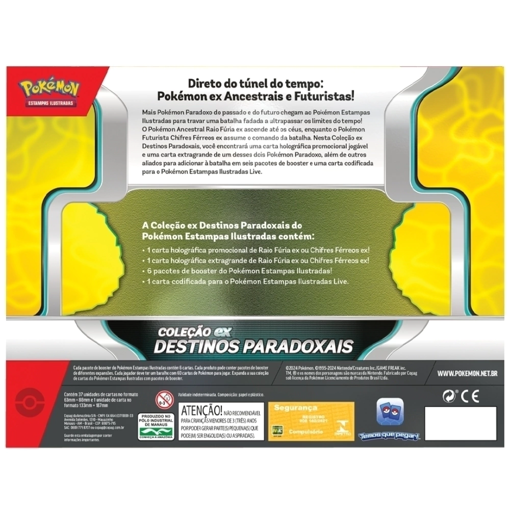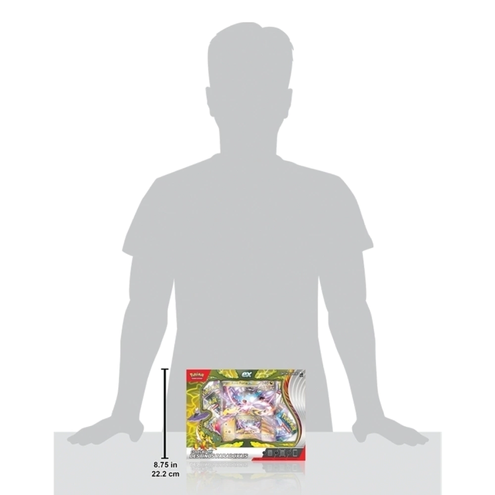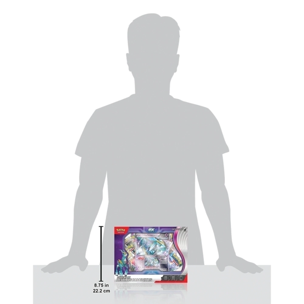 Nesta Coleção ex Destinos Paradoxais, você encontrará uma carta holográfica promocional jogável e uma carta extragrande de um desses dois Pokémon Paradoxo, além de outros aliados para adicionar à batalha em seis pacotes de booster e uma carta codificada para o Pokémon Estampas Ilustradas Live.