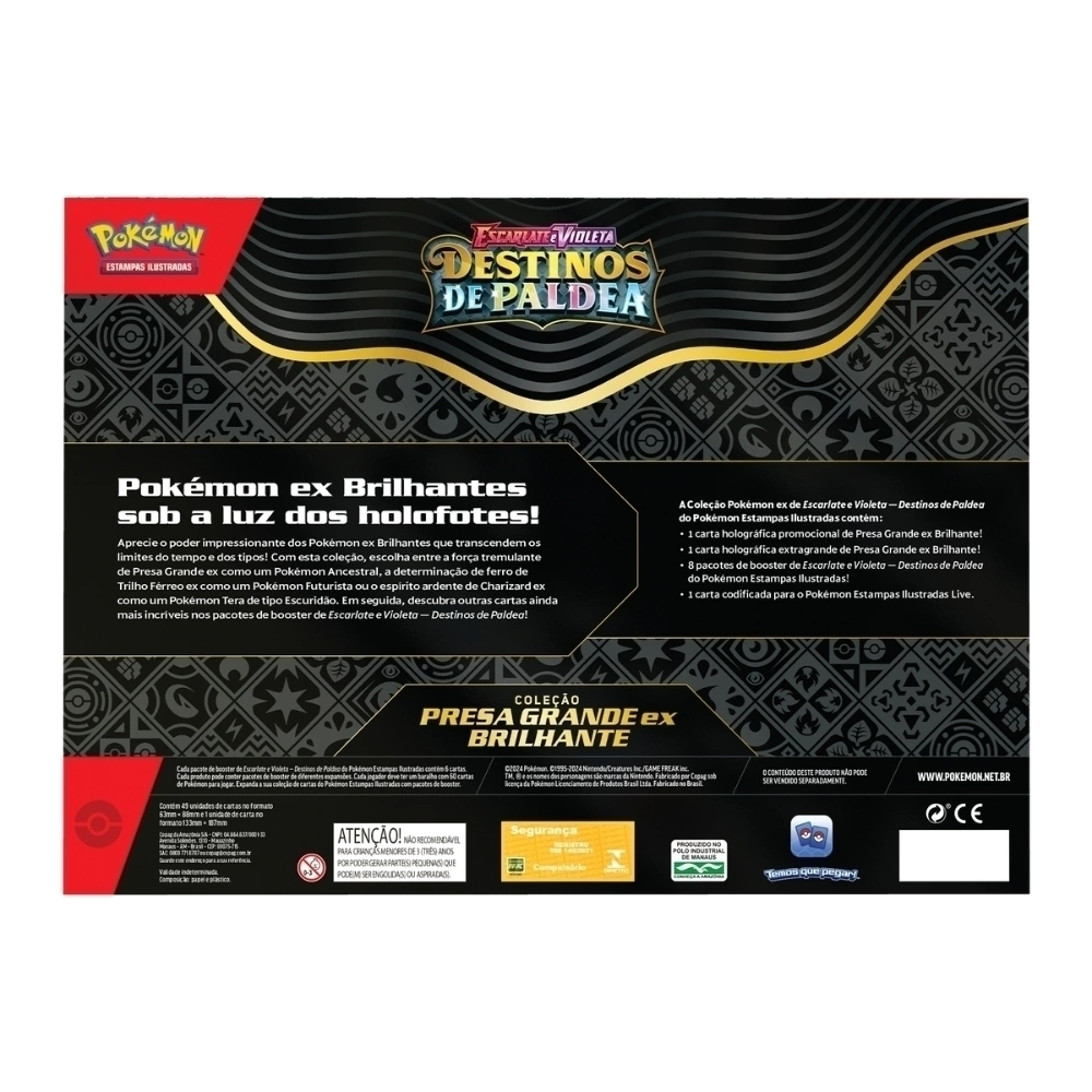 Aprecie o poder impressionante dos Pokémon ex Brilhantes que transcendem os limites do tempo e dos tipos! Com esta coleção, escolha entre a força tremulante de Presa Grande ex como um Pokémon Ancestral, a determinação de ferro de Trilho Férreo ex como um Pokémon Futurista ou o espírito ardente de Charizard ex como um Pokémon Terra de tipo Escuridão.