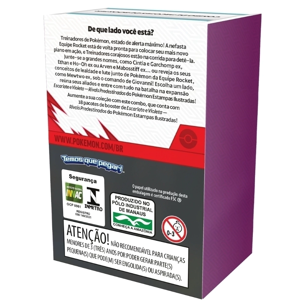 Junte-se a grandes nomes, como Cíntia e Garchomp ex, Ethan e Ho-Oh ex ou Arven e Mabosstiff ex... ou reveja os seus conceitos de lealdade e lute junto de Pokémon da Equipe Rocket, como Mewtwo ex, sob o comando de Giovanni! Escolha um lado, reúna seus aliados e entre com tudo na batalha na expansão Escarlate e Violeta — Rivais Predestinados do Pokémon Estampas Ilustradas!