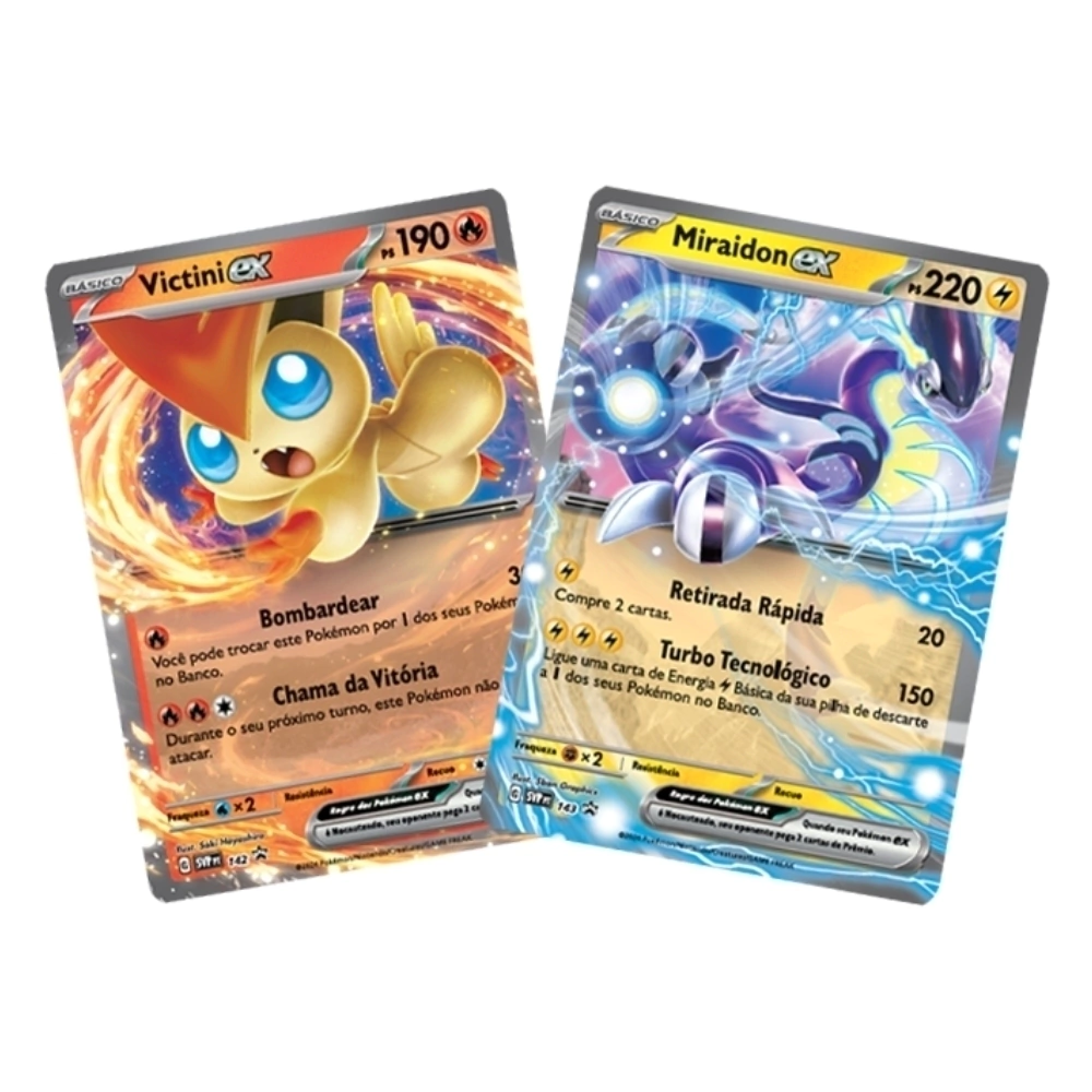 - A Variação (Kit 1 de cada) Contém: 1 Unidade da Box Pokémon Deck Baralho de Batalha Ex Miraidon EX Original Lacrado Copag 60 Cartas Pra Jogar NV1 + 1 Unidade da Box Pokémon Deck Baralho de Batalha Ex Victini EX Original Lacrado Copag 60 Cartas Pra Jogar NV1;