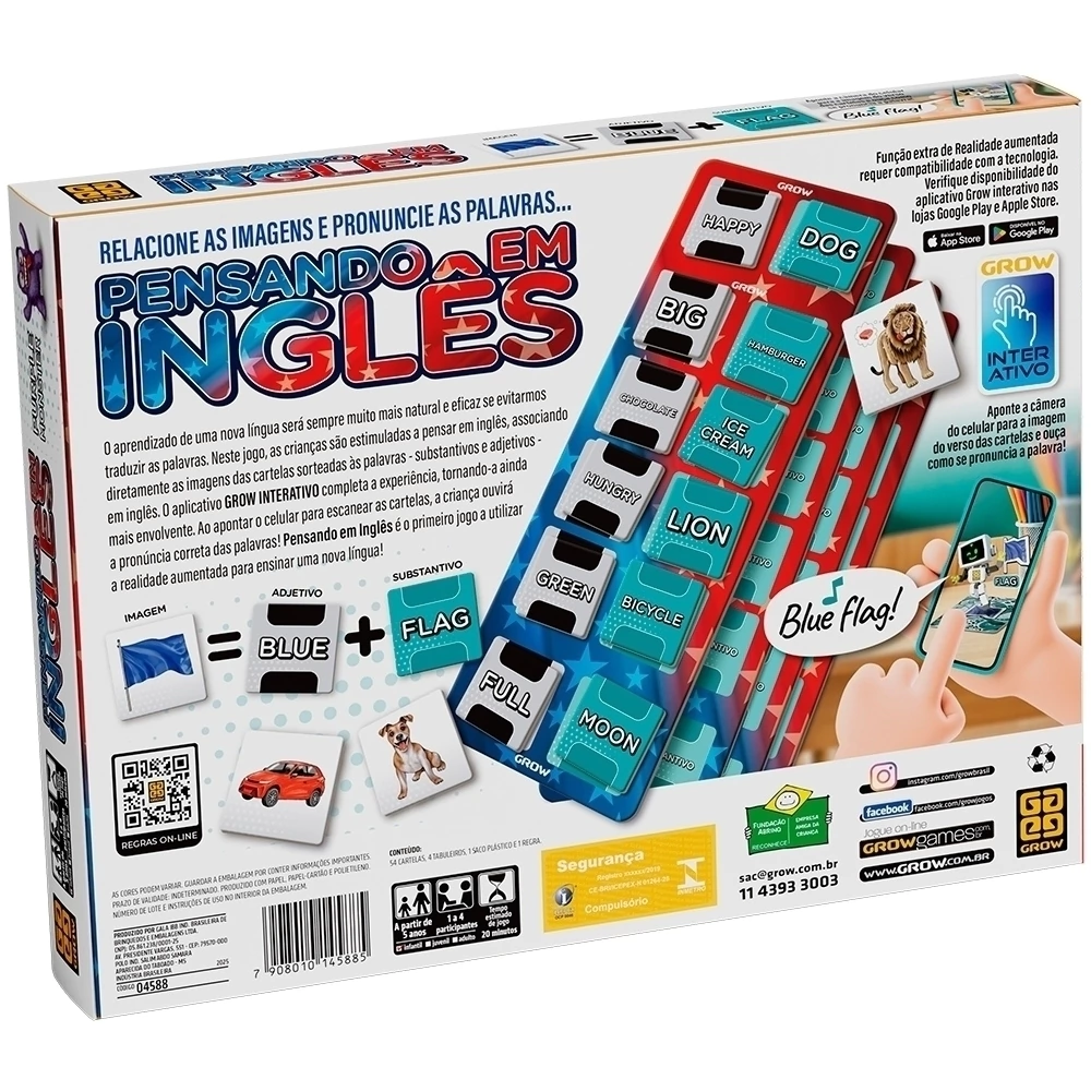 O aplicativo GROW INTERATIVO completa a experiência, tornando-a ainda mais envolvente. Ao apontar o celular para escanear as cartelas, a criança ouvirá a pronúncia correta das palavras! Pensando em Inglês é o primeiro jogo a utilizar a realidade aumentada para ensinar uma nova língua!