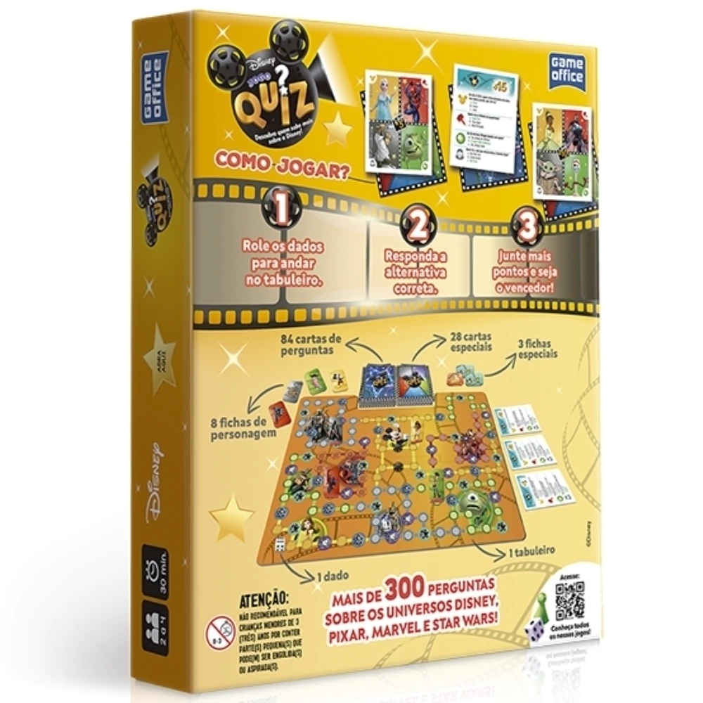 - Contém: 1 tabuleiro, 3 fichas especiais, 28 cartas especiais, 84 cartas de perguntas, 8 fichas de personagem, 1 dado.