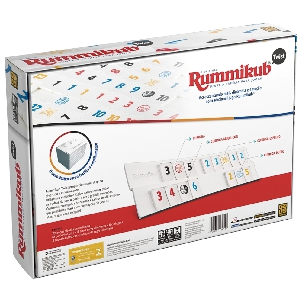 - Contém: 112 peças plásticas numeradas (8 conjuntos de 1 a 13 com 4 cores diferentes e 8 curingas), 4 suportes plásticos e 1 manual de regras ilustrado.