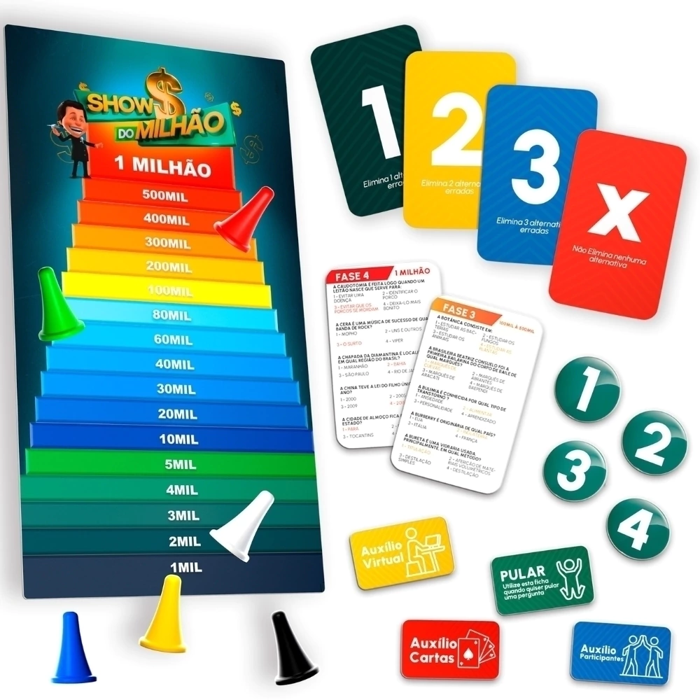 Prepare-se para testar seus mais diversos conhecimentos com o maior game show da TV brasileira em um jogo de tabuleiro colorido e interativo com mais de 800 perguntas. O Show do Milhão, que ganhou sucesso com o grande Silvio Santos, no SBT, agora apresentado por Patrícia Abravanel, ganha uma versão para jogar em casa, com toda a família e amigos!