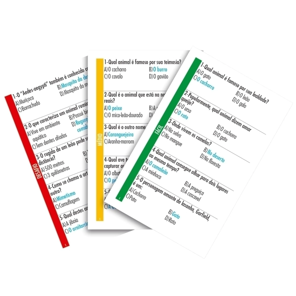 São 100 cartas com 500 perguntas de múltipla escolha e diferentes níveis de dificuldade, para que os participantes possam mostrar todo seu conhecimento sobre o mundo animal e ao mesmo tempo conhecer divertidas curiosidades do tema.