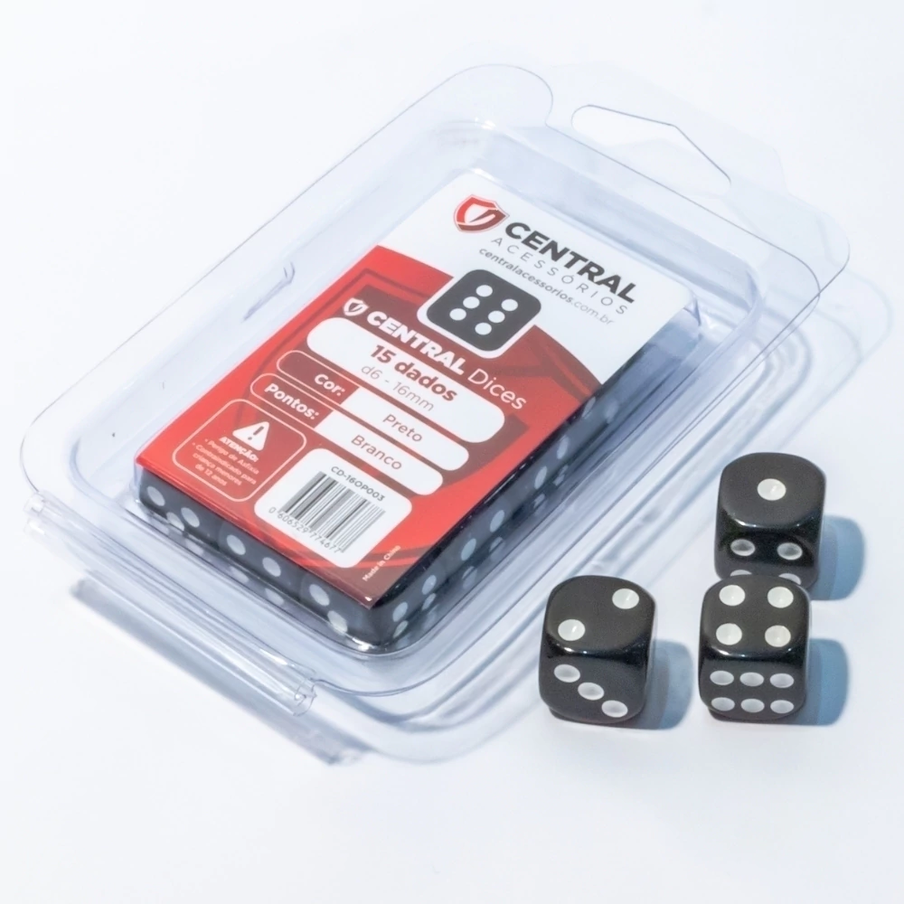 - Contém: 15 dados pretos com pontos brancos D6 - 16mm