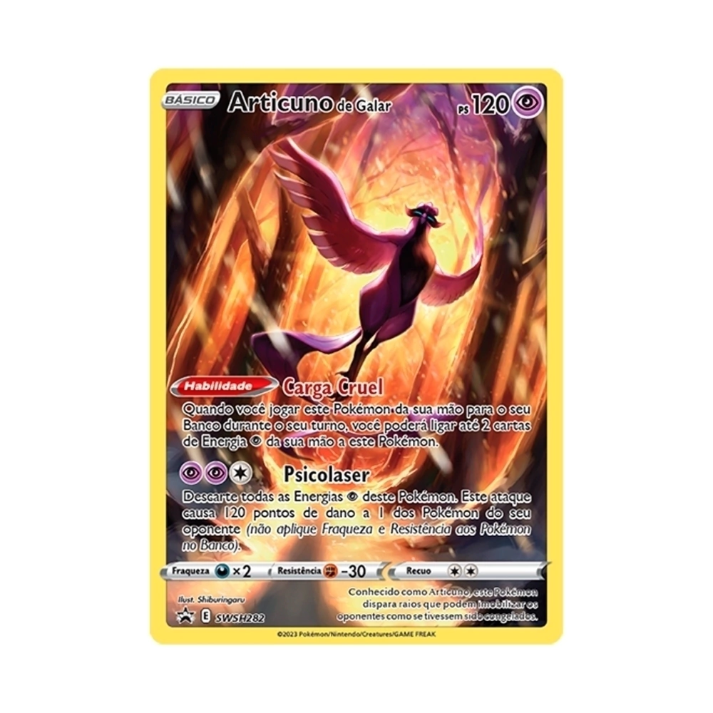 Adicione esse poder à sua coleção do Pokémon Estampas Ilustradas e veja por si mesmo! O que você vai escolher? A atitude atroz de Articuno de Galar, o entusiasmo ligeiro de Zapdos de Galar ou a malícia malévola de Moltres de Galar? Independentemente de sua escolha, você também encontrará 5 pacotes de booster da expansão especial Realeza Absoluta do Pokémon Estampas Ilustradas e 1 carta codifificada para o Pokémon Estampas Ilustradas Live!