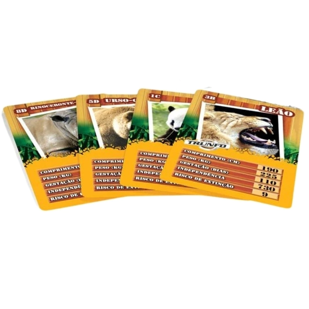 Super Trunfo Animais Selvagens traz 32 cartas com imagens e informações de animais selvagens para uma disputa superdivertida! Você compara sua carta com a do outro jogador. Mas escolha bem a característica que vai utilizar a cada rodada, pois, se sua carta ganhar, você fica com a carta do outro jogador; se perder, ele fica com a sua! No final, vence quem ganha todas as cartas do jogo.
